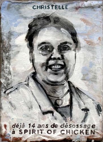 Lamalattie launched into a kind of census by painting portraits which combine a face and a sentence, a summary of their past life, their vocation. To seize their essence as with pincers, the painter achieves a synergy between image and text beyond the degree of calculation found in actual resumes. First of all, it is rather humorous: Jean-Paul is an early riser, which seems plausible from his looks. What a tragic epoch, which thinks it is possible to summarize someone’s life around a major contradiction! Thus the not-aptly-named Pâquerette (Daisy) (since, in French, Pâques means Easter): “She does not imagine anything, not even her resurrection”. Very often there are, at the same character, an explosive mixture between high aspirations and renouncement.