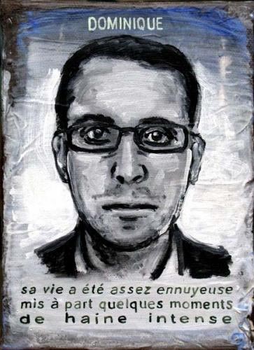 Pierre Lamalattie depicts a society where economy has pride of place, which goes right to the essential: painting allows to grasp instantly an immediate presence, which may be the reason for the discoloration of his paintings, in bluish grey hues. In spite of the usual formula “Any resemblance with actual persons is purely coincidental…” we recognize a neighbor, a cousin, a head clerk, a cashier… This is because Pierre Lamalattie paints prototypes while taking as a starting point a now pervasive practice: resumes. They condense the persons’ experience in a few lines and a photograph, without any irrelevant details.