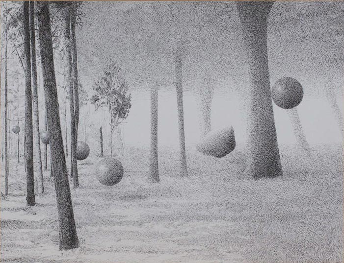 Since 1968, Jean de Maximy, a virtuoso of the Rotring pen and black ink, has been acting as a Sphinx, developing his explosive device: it unreels, unrolls, calculates, meditates on a hundred sheets of the same format (50 x 65 cm) attached alongside each other. He weaves, knits, braids, crosses, reworks, from black to white, grays out and clears up, ties and unties his linear drawing without any previous plan or narrative goal. In mathematics, series are sequences of patterns; a particular case is the one of an “exact sequence in singular homology”. Maximy’s drawings do not require any exactness. The title was suggested by a friend of his, a theorist in nuclear and particle physics. But interestingly, one notes eventually that this inexactness inaccuracy does tell something.